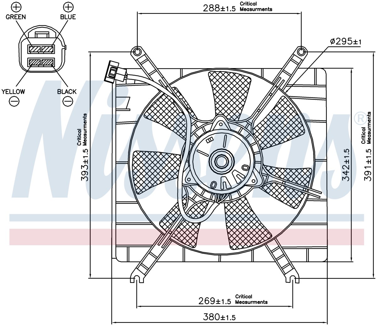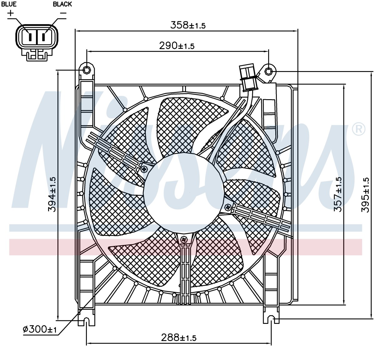 Ventilátorlapátok száma: 7 Átmérő (mm): 300 Csatlakozó alakja: Rectangular Teljesítmény (W): 100, 70 Feszültség (V): 12 Forgási irány: Óramutató irányában Egyéb: with radiator fan shroud